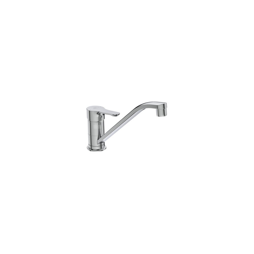 Bateria kuchenna z niską wylewką. Głowica ceramiczna 35 mm z ogranicznikiem temperatury. Metalowy uchwyt z nadrukowanymi czerwonymi i niebieskimi oznaczeniami. Technologia Click. Aerator (perlator). System montażu Easy-Fix. Wężyki przyłączeniowe G3/8”. Zgodność z normą EN 817.