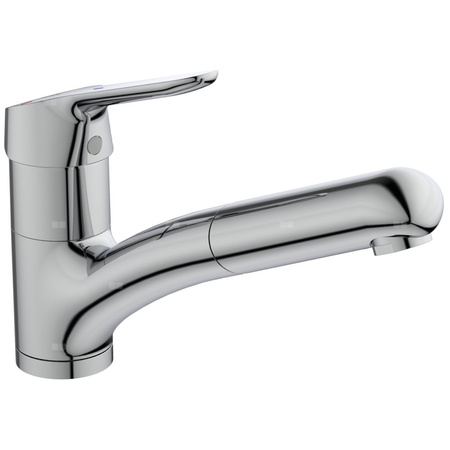 Obracana i wciągana wylewka. Metalowy uchwyt z nadrukowanymi czerwonymi i niebieskimi oznaczeniami. Technologia BlueStart® - uchwyt na wprost, przepływ wody wody zimnej. Aerator typu Perlator M24x1. Głowica 38 mm CLICK z funkcją ECO i ogranicznikiem temperatury wody. Wężyki przyłączeniowe G3/8”.
