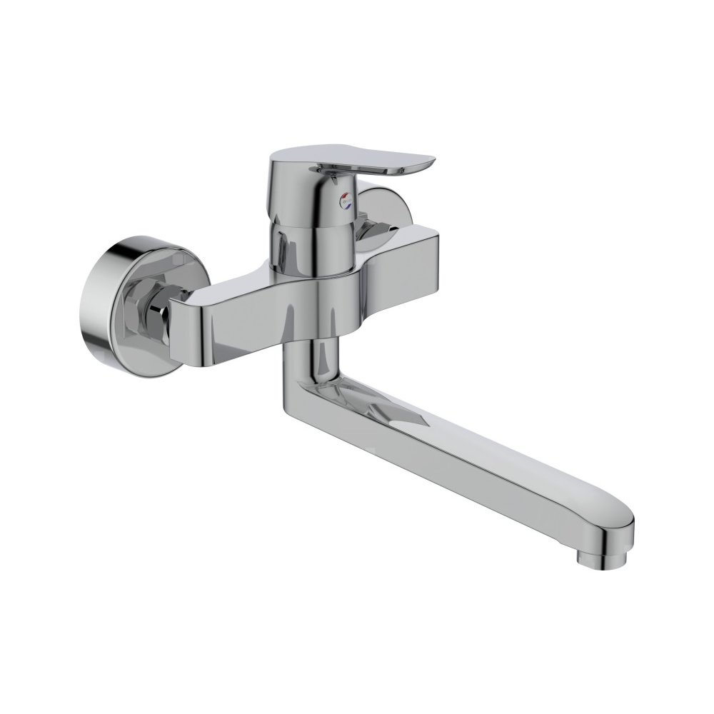 Głowica ceramiczna 35 mm z ogranicznikiem temperatury wody. Metalowy uchwyt, wskaźnik woda ciepła/zimna. Aerator Neopearl odporny na osadzanie kamienia. Standardowe przyłącza ścienne. Ruchoma wylewka dł. 20 cm.