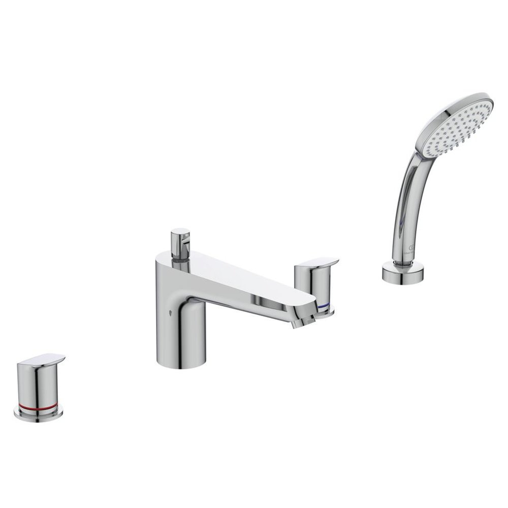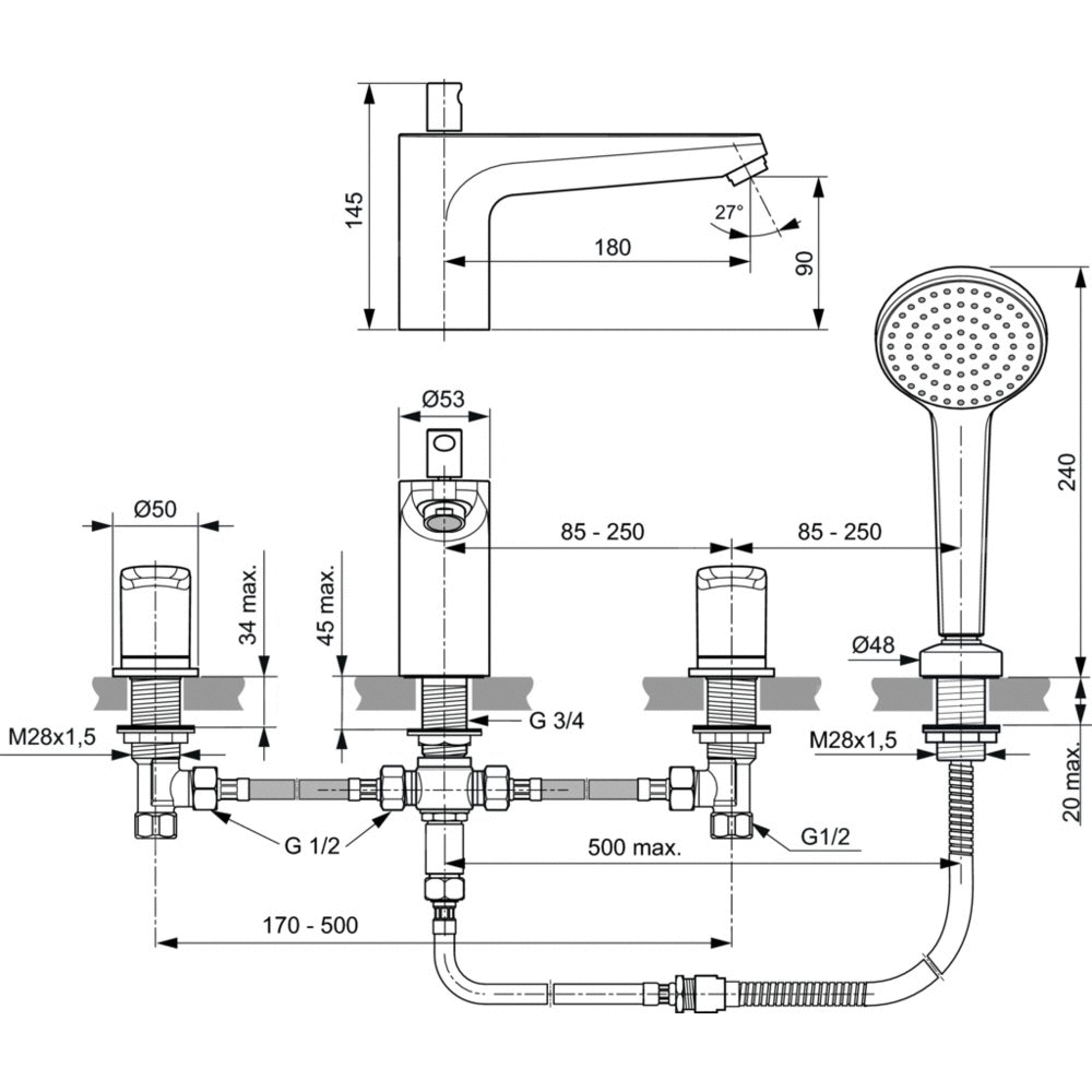 Bateria dwuuchwytowa. Głowice ceramiczne 90˚. Wylewka stojąca. Przełącznik automatyczny. Aerator typu Perlator. Z akcesoriami: Słuchawka prysznicowa 100 mm, 1F z ogranicznikiem 8l/min. Metalowy wąż natryskowy. Zgodna z EN817.