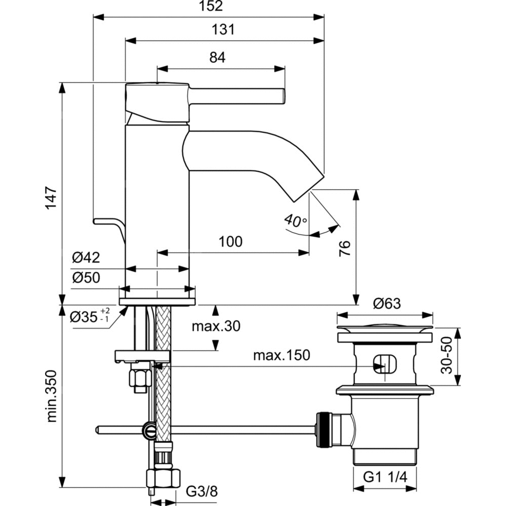 Głowica ceramiczna 28 mm z ogranicznikiem temperatury wody. Metalowy uchwyt z nadrukowanymi czerwonymi i niebieskimi oznaczeniami. Aerator ukryty Cache - z ogranicznikiem przepływu wody do 5l/min. Adapter do zmiany przepływ wodyu wody na laminarny (bez napowietrzenia). Metalowy korek automatyczny. Wężyki przyłączeniowe PEX G3/8".