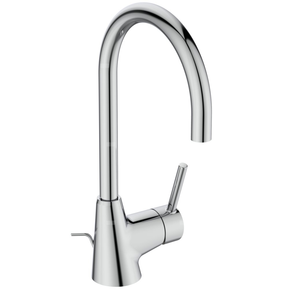Bateria wysoka do umywalek nablatowych. Głowica ceramiczna 35 mm z ogranicznikiem temperatury wody. Metalowy uchwyt z nadrukowanymi czerwonymi i niebieskimi oznaczeniami. Wysoka wylewka R160. Aerator typu Perlator - z ogranicznikiem przepływu wody do 5l/min. Metalowy korek automatyczny. Wężyki przyłączeniowe PEX G3/8".