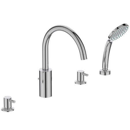 Czterootworowa bateria wannowo-natryskowa z wylewką. System przyłączeniowy G1/2 z uszczelnieniem. Głowice ceramiczne ciepłej i zminej wody G1/2 90°. Z akcesoriami: słuchawka IdealRain Soft 3-funkcyjna 80 mm,. wąż w podwójnym oplocie metalowym). Metalowe uchwyty. Przełącznik manulany wanna/natrysk. Aerator typu perlator.