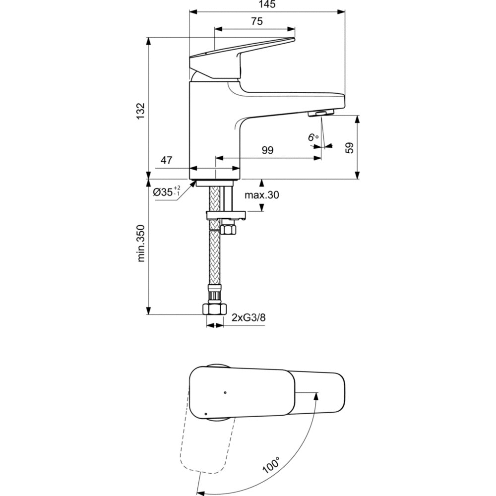 Bateria umywalkowa stojąca. Jednootworowa z obszarem Comfort pod aeratorem: 60 mm. Innowacyjna ceramiczna głowica FirmaFlow 38 mm z ogranicznikiem temperatury. Metalowy uchwyt z nadrukowanymi czerwonymi i niebieskimi oznaczeniami. Smukły aerator z ogranicznikiem przepływu wody do 5 l/min. System montażu Easy-Fix. Wężyki przyłączeniowe G3/8”. Technologia Blue Start.