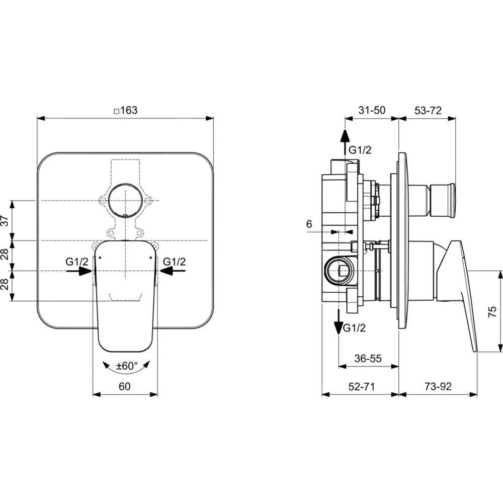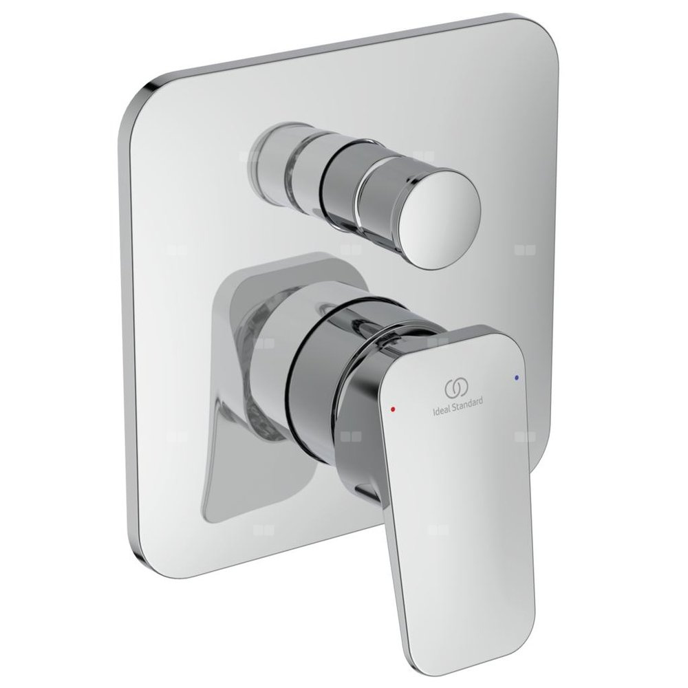 Głowica, 47 mm, z ograniczeniem temperatury wody. Metalowy uchwyt z oznaczeniem wody: ciepła/zimna. Przełącznik automatyczny wanna/natrysk. Rozeta maskująca z tworzywa, chromowana. W komplecie zestaw montażowy.