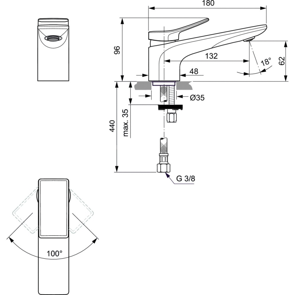 Głowica ceramiczna 28 mm z ogranicznikiem temperatury wody. Logo Ideal Standard umieszczone na korpusie baterii. Metalowy uchwyt bez oznaczeń. Aerator M24x1 z ogranicznikiem przepływu wody do 5 l/min. System montażu EASY-FIX. Wężyki przyłączeniowe G3/8".