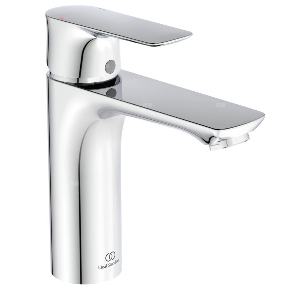 Bateria umywalkowa jednootworowa Grande do niskiego ciśnienia ND. Bez metalowego korka automatycznego. Mosiężny, odlewany korpus 48 mm. Metalowy uchwyt z nadrukowanymi czerwonymi i niebieskimi oznaczeniami. Mocowanie uchwytu przedniego. Chromowany przycisk. Przepływ M24x1 do niskiego ciśnienia, głowica FirmaFlow 38 mm z ogranicznikiem temperatury. Bez funkcji Click. Elastyczne wężyki przyłączeniowe PEX G3/8" (3 szt.).