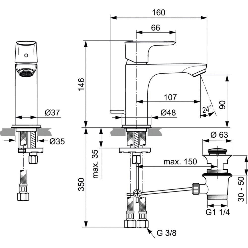 Bateria umywalkowa jednootworowa, smukły metalowy korpus 37 mm. Głowica 28 mm. Metalowy automatyczny korek. Aerator typu Perlator M24x1. Metalowy uchwyt z nadrukowanymi czerwonymi i niebieskimi oznaczeniami. Elastyczne wężyki przyłączeniowe PEX G3/8".