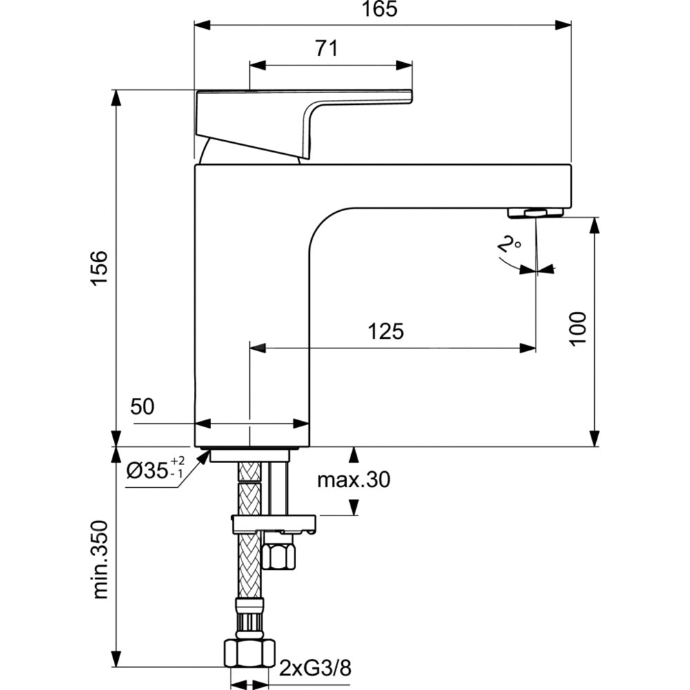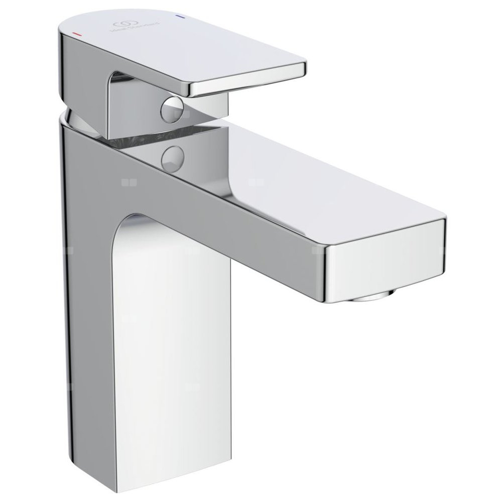 Bateria umywalkowa bez metalowego korka automatycznego. Głowica FirmaFlow ISI 38 mm z ogranicznikiem temperatury. Metalowy uchwyt z logo Ideal Standard oraz nadrukowanymi czerwonymi i niebieskimi oznaczeniami. Aerator typu Perlator M24x1 - z ogranicznikiem przepływu wody do 5l/min. Klasa akustyczna 1. Wężyki przyłączeniowe PEX G3/8". System montażu EASY-FIX. Zgodna z EN817.
