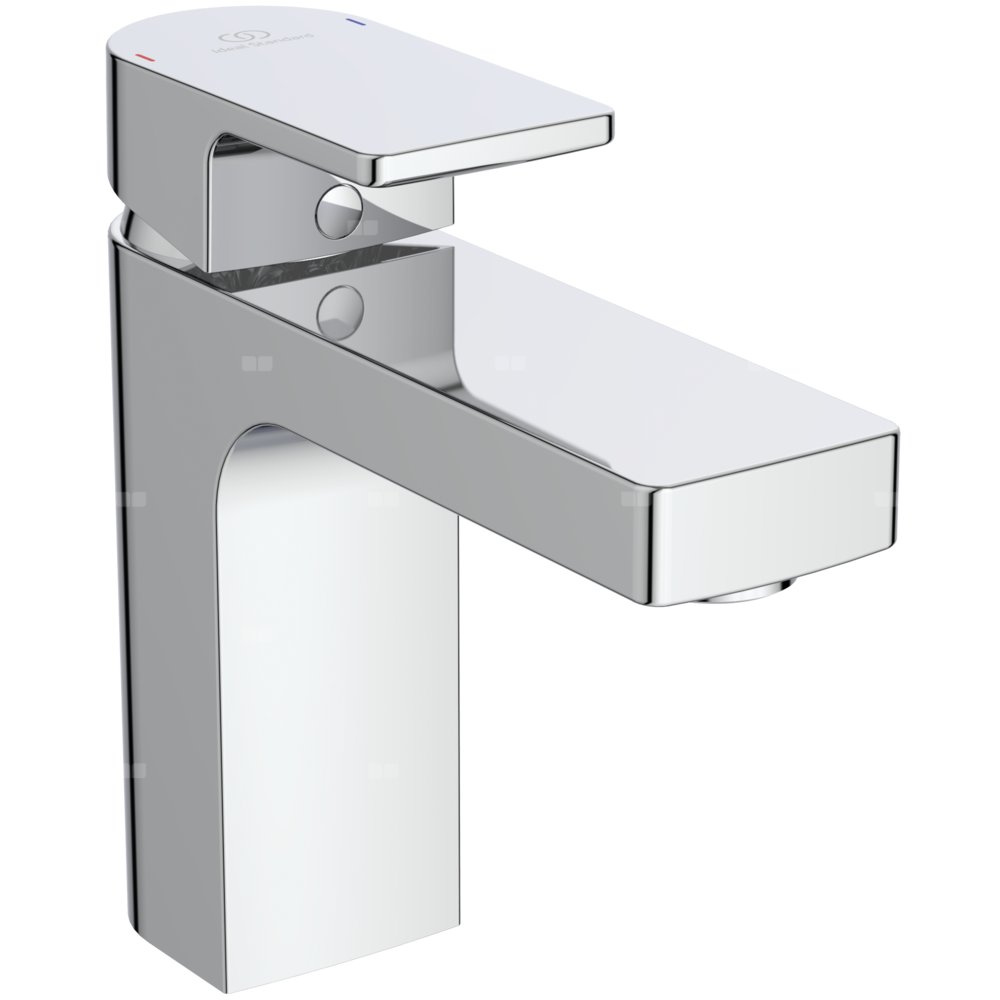 Bateria umywalkowa z metalowym korkiem automatycznym. Głowica FirmaFlow ISI 38 mm z ogranicznikiem temperatury. Metalowy uchwyt z logo Ideal Standard oraz nadrukowanymi czerwonymi i niebieskimi oznaczeniami. Aerator typu Perlator M24x1 - z ogranicznikiem przepływu wody do 5l/min. Klasa akustyczna 1. Wężyki przyłączeniowe PEX G3/8". System montażu EASY-FIX. Zgodna z EN817.