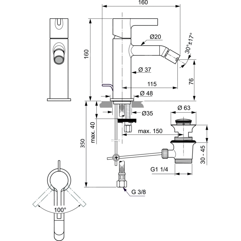 Głowica ceramiczna 28 mm z ogranicznikiem temperatury wody. Logo Ideal Standard umieszczone na korpusie baterii. Metalowy uchwyt bez oznaczenia wody ciepłej i zimnej. Aerator typuBall Joint M18x1 z ogranicznikiem przepływu wody do 5 l/min. System montażu EASY-FIX. Wężyki przyłączeniowe G3/8". Metalowy korek automatyczny.