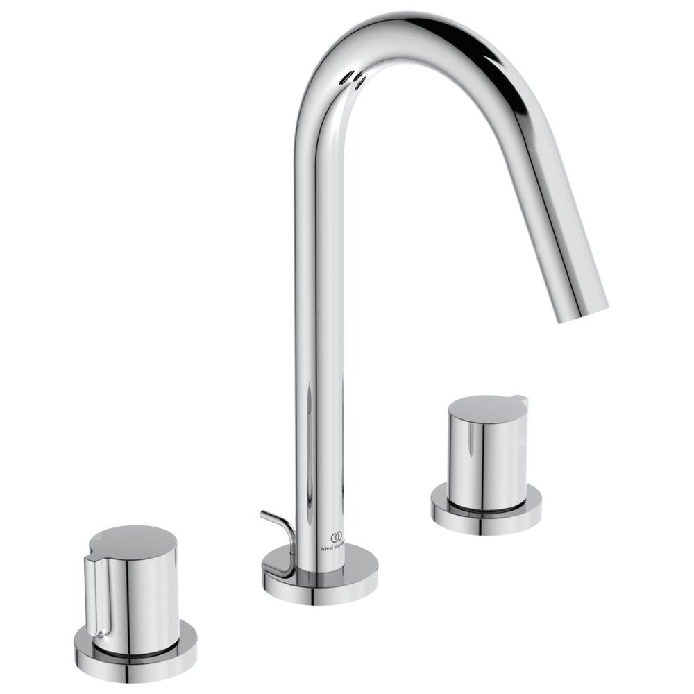 Głowica ceramiczna 28 mm z ogranicznikiem temperatury wody. Logo Ideal Standard umieszczone na korpusie wylewki. Metalowy uchwyt bez oznaczenia wody ciepłej i zimnej. Aerator typu Caché M16,5x1 z ogranicznikiem przepływu wody do 5 l/min. System montażu EASY-FIX. Wężyki przyłączeniowe G3/8". Metalowy korek automatyczny.