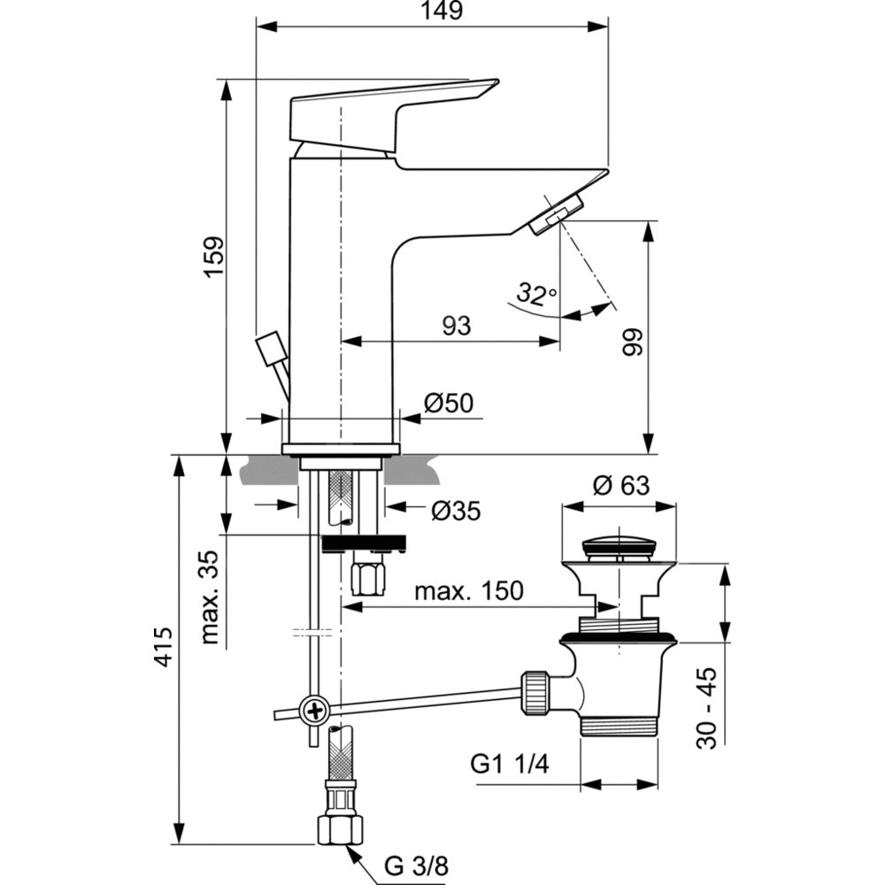 Bateria umywalkowa Tesi z metalowym automatycznym korkiem. Głowica ceramiczna IS 28 mm z ogranicznikiem temperatury. Mosiężny, odlewany korpus. Metalowy uchwyt z nadrukowanymi czerwonymi i niebieskimi oznaczeniami. Perlator typu Cascade z ogranicznikiem przepływu wody do 5 l/min. Wężyki przyłączeniowe G3/8".