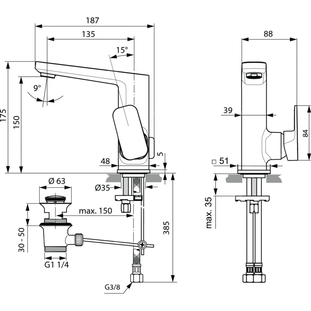 Bateria umywalkowa wysoka z głowicą ceramiczną 28 mm i ogranicznikiem temperatury. Mosiężny, odlewany korpus. Metalowy uchwyt z nadrukowanymi czerwonymi i niebieskimi oznaczeniami oraz metalowy korek automatyczny. Perlator typu Cascade z ogranicznikiem przepływu wody do 5 l/min i regulacją kierunku strumienia. Elastyczne węże przyłączeniowe z gwintem G3/8". System montażu EASY-FIX. Metalowy pierścień.