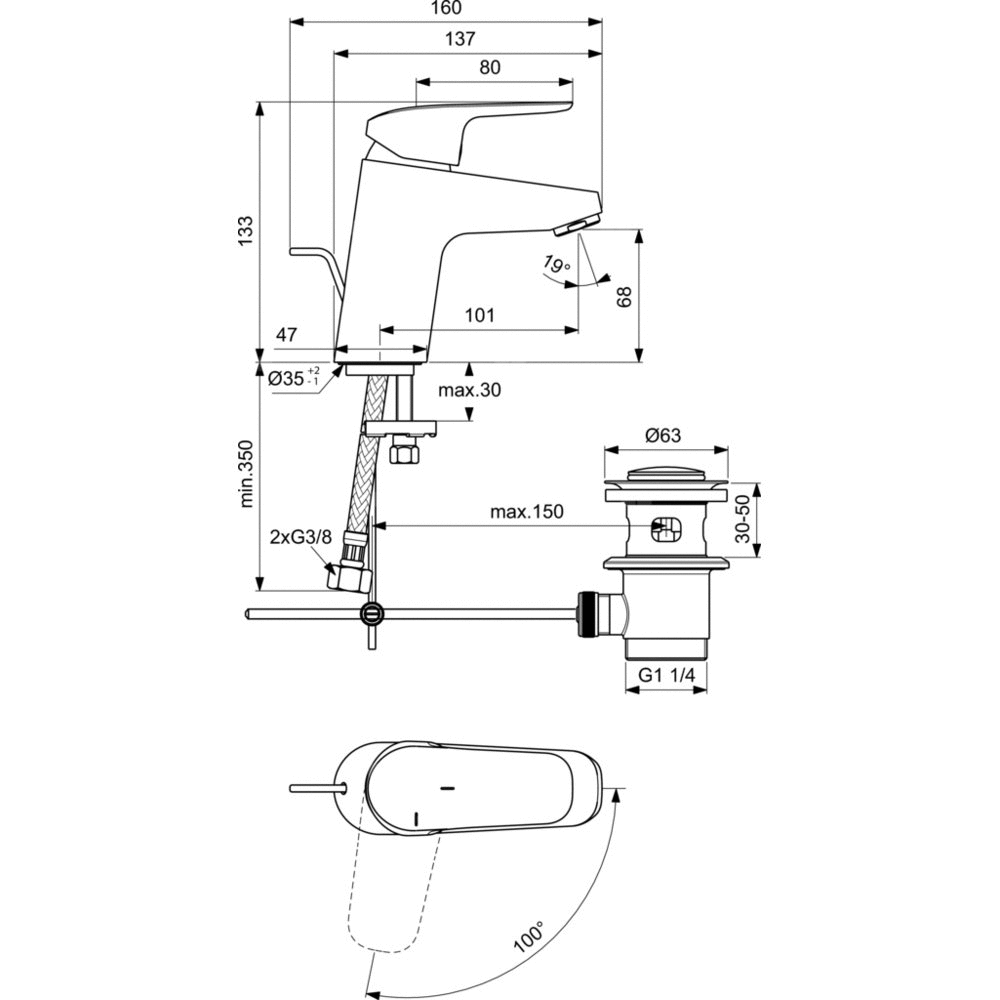 Głowica ceramiczna 40 mm z ogranicznikiem temperatury. Odlewany korpus z mosiądzu. Metalowy uchwyt z nadrukowanymi czerwonymi i niebieskimi oznaczeniami. Aerator typu Perlator, 5l/min. Metalowy korek automatyczny. Wężyki przyłączeniowe G3/8”. System montażu EASY-FIX. Zgodność z EN817.