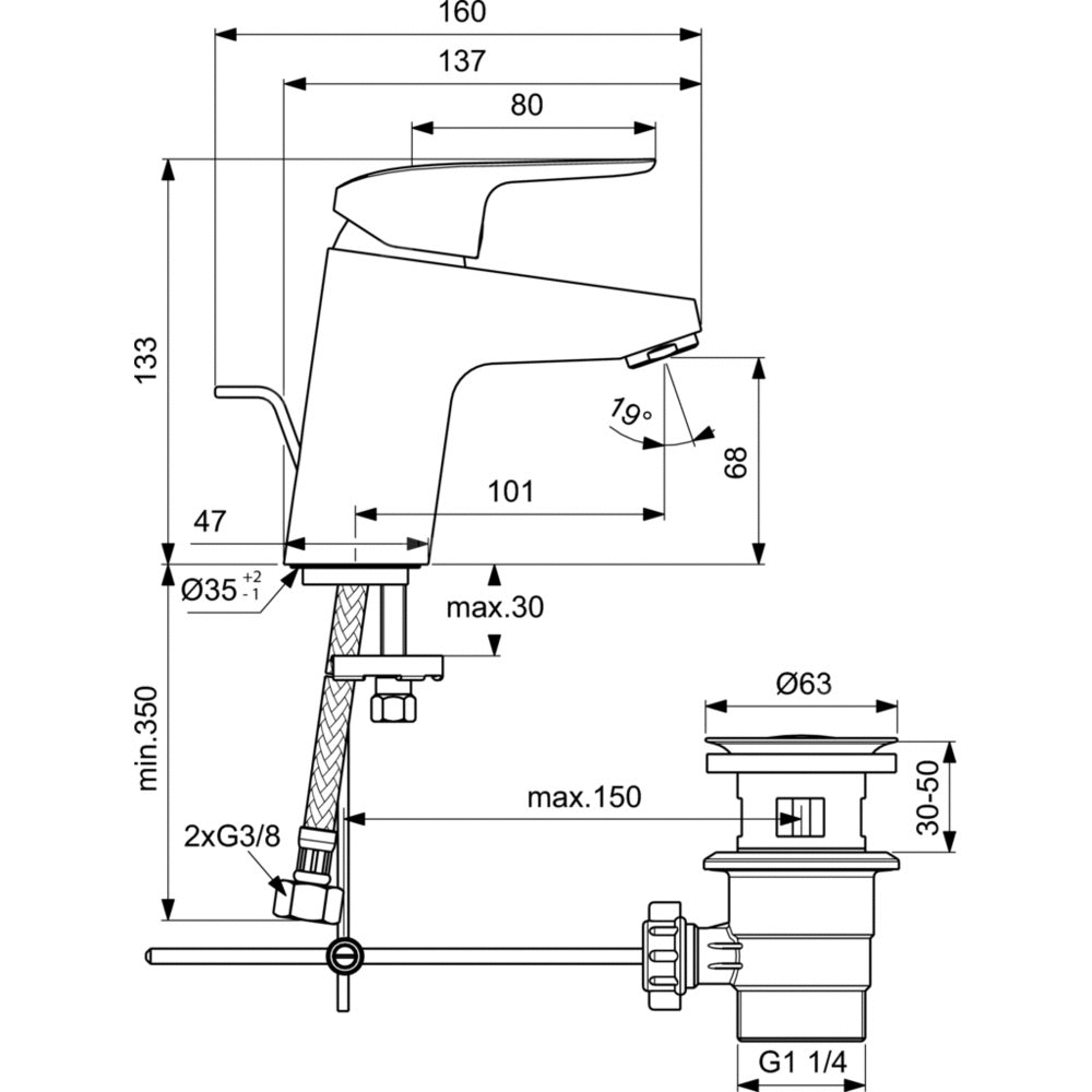 Bateria umywalkowa stojąca. Innowacyjna ceramiczna głowica FirmaFlow 38 mm, z funkcją. ograniczenia temperatury wody. Metalowy korpus. Metalowy uchwyt z oznaczeniem wody: ciepła/zimna. Smukły aerator (perlator) z ogranicznikiem przepływu wody. do 5 l/min. Korek automatyczny z tworzywa. Wężyki przyłączeniowe G3/8”. System montażu Easy-Fix. Zgodność z EN817.