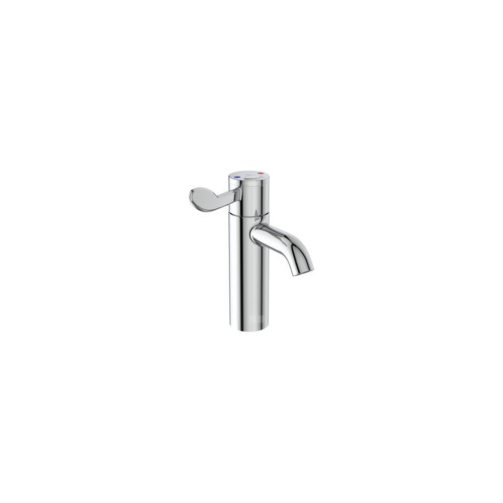 Jednootworowa bateria umywalkowa sekwencyjna Ceraplus. Odlewany korpus z wylewką zapewniającą samoczynny odpływ wody. Metalowy uchwyt medyczny dł. 120 mm. z oznaczeniem wody ciepłej i zimnej. Wandaloodporny perlator ograniczający napowietrzenie strumienia wody. Wężyki przyłączeniowe PEX G3/8". Termostatyczna głowica sekwencyjna (Cycle Valve) z ogranicznikiem temperatury. Funcja dezynfekcji termicznej. Zawór zwrotny. Klasa akustyczna 1. Zgodna z EN817. Wszystkie materiały w baterii, które mają kontakt z wodą pitną są zgodne z wymaganiami KTW, ACS i WRAS.