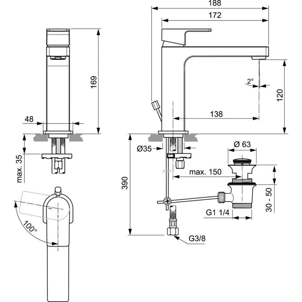 Bateria umywalkowa z metalowym korkiem automatycznym. Głowica ceramiczna IS 28 mm. Metalowy uchwyt z logo Ideal Standard oraz nadrukowanymi czerwonymi i niebieskimi oznaczeniami. Aerator typu Perlator M24x1 - z ogranicznikiem przepływu wody do 5l/min. Technologia Blue Start. Metalowy pierścień uszczelniający. Klasa akustyczna 1. Wężyki przyłączeniowe PEX G3/8". System montażu EASY-FIX. Zgodna z EN817.