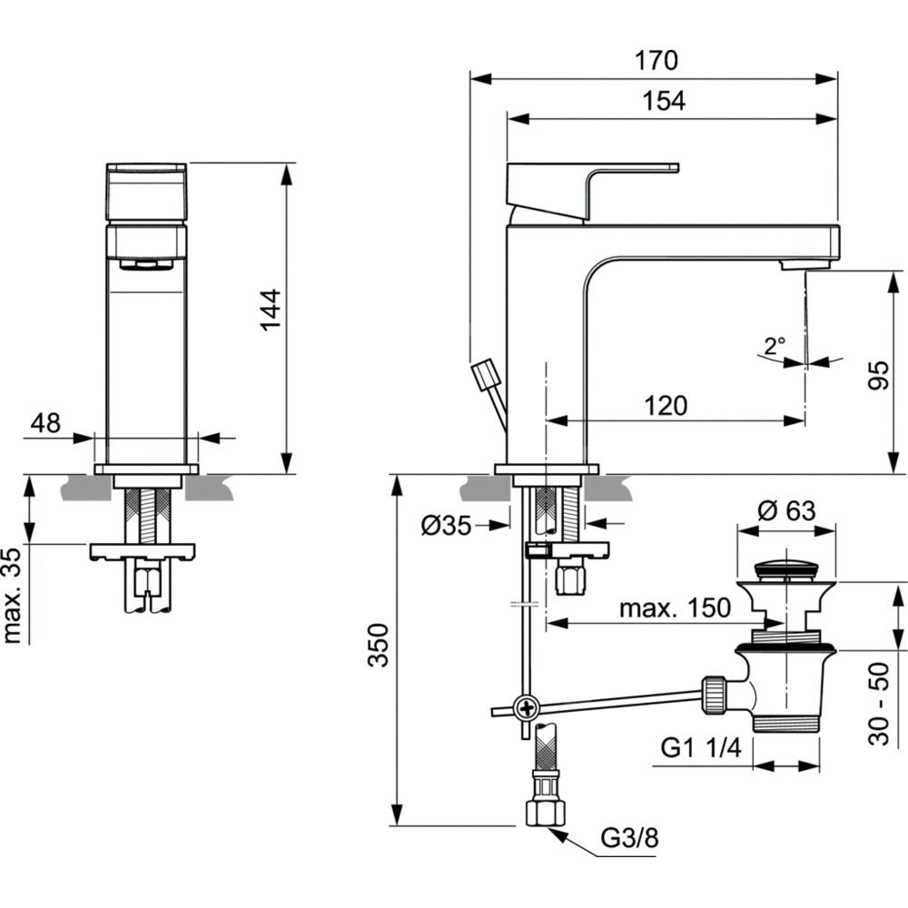 Bateria umywalkowa z metalowym korkiem automatycznym. Głowica ceramiczna IS 28 mm. Metalowy uchwyt z logo Ideal Standard oraz nadrukowanymi czerwonymi i niebieskimi oznaczeniami. Aerator typu Perlator M24x1 - z ogranicznikiem przepływu wody do 5l/min. Metalowy pierścień uszczelniający. Klasa akustyczna 1. Wężyki przyłączeniowe PEX G3/8". System montażu EASY-FIX. Zgodna z EN817.