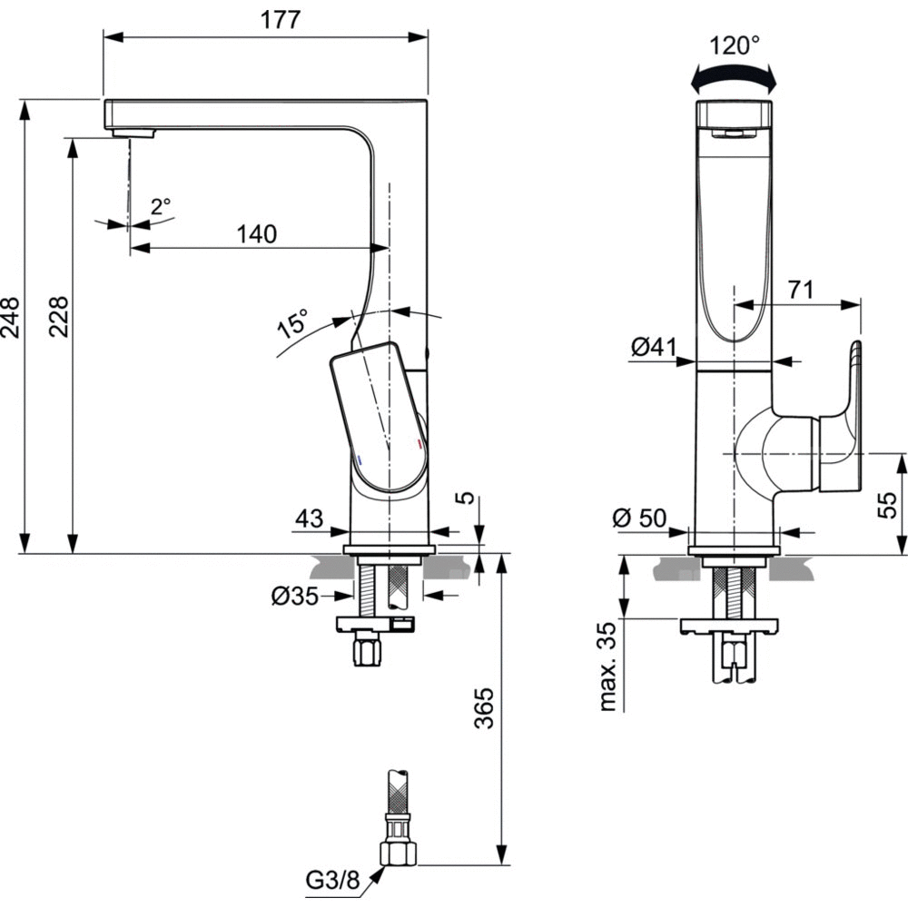 Bateria umywalkowa bez metalowego korka automatycznego. Głowica ceramiczna IS 28 mm z ogranicznikiem temperatury. Metalowy uchwyt z logo Ideal Standard oraz nadrukowanymi czerwonymi i niebieskimi oznaczeniami. Aerator typu Perlator M24x1 - z ogranicznikiem przepływu wody do 5l/min. Metalowy pierścień uszczelniający. Klasa akustyczna 1. Wężyki przyłączeniowe PEX G3/8". System montażu EASY-FIX. Zgodna z EN817.