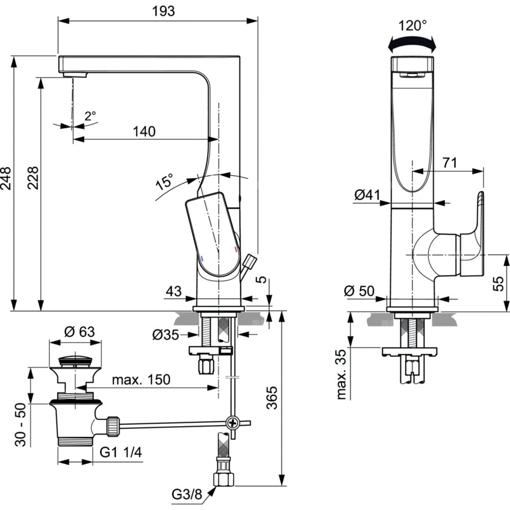 Bateria umywalkowa z metalowym korkiem automatycznym. Głowica ceramiczna IS 28 mm z ogranicznikiem temperatury. Metalowy uchwyt z logo Ideal Standard oraz nadrukowanymi czerwonymi i niebieskimi oznaczeniami. Aerator typu Perlator M24x1 - z ogranicznikiem przepływu wody do 5l/min. Metalowy pierścień uszczelniający. Klasa akustyczna 1. Wężyki przyłączeniowe PEX G3/8". System montażu EASY-FIX. Zgodna z EN817.