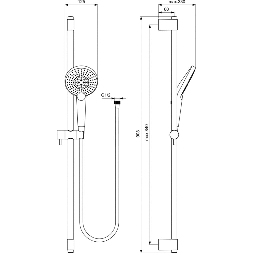 Metalowy drążek prysznicowy długości 900 mm. Regulowane metalowe mocowanie słuchawki. Wąż Idealflex 1750 mm z tworzywa odpornego na osad kamienia. Trzyfunkcyjna słuchawka średnicy Ø 125 mm. Rodzaje strumienia wody: deszcz, drop jet, masaż. Wybór strumienia wygodnym przyciskiem Navigo. Gumowe końcówki dysz zapobiegające osadzaniu się kamienia. Ogranicznik przepływu wody do 8 l/min. Minimalne ciśnienie wody 0,1 bar.
