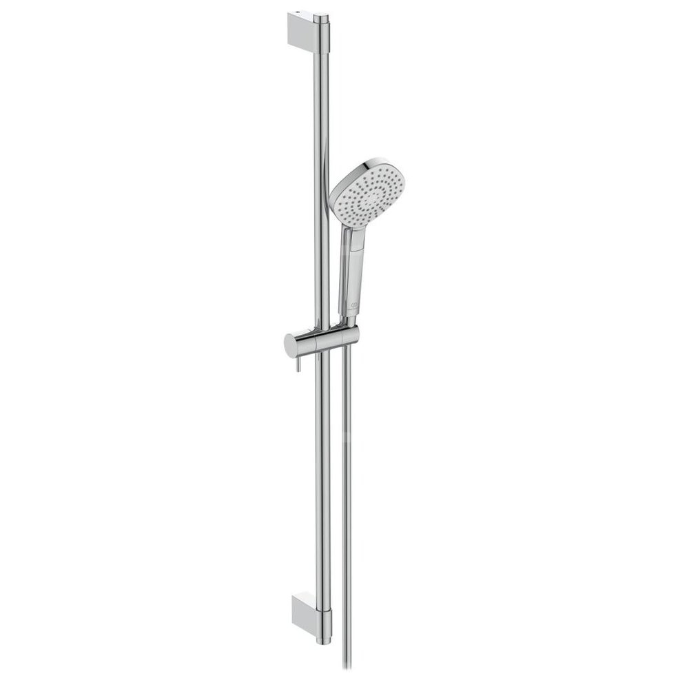 Metalowy drążek prysznicowy długości 900 mm. Regulowane metalowe mocowanie słuchawki. Wąż Idealflex 1750 mm z tworzywa odpornego na osad kamienia. Trzyfunkcyjna słuchawka średnicy Ø 115 mm. Rodzaje strumienia wody: deszcz, deszcz napowietrzony, masaż. Wybór strumienia wygodnym przyciskiem Navigo. Gumowe końcówki dysz zapobiegające osadzaniu się kamienia. Ogranicznik przepływu wody do 8 l/min. Minimalne ciśnienie wody 0,1 bar.