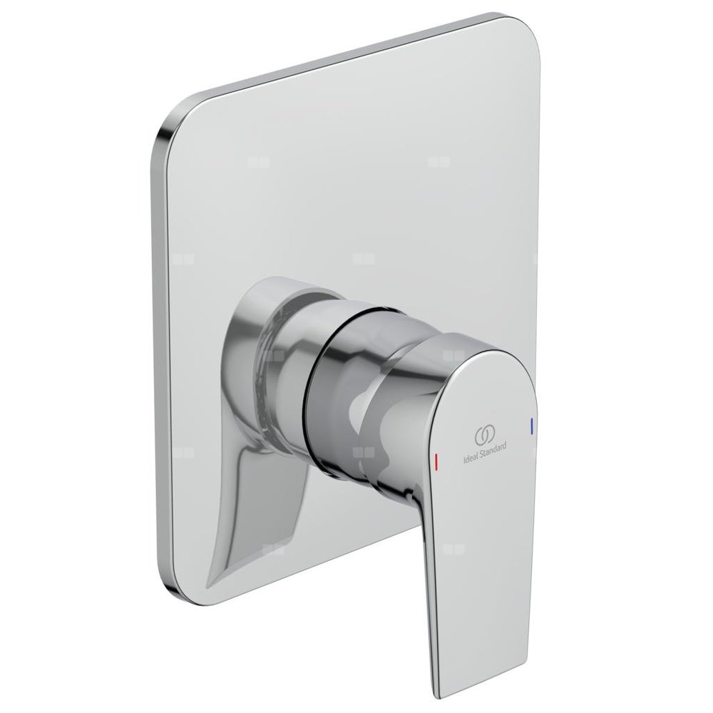 Zestaw montażowy baterii natryskowej podtynkowej Tesi. Głowica ceramiczna IS 47 mm z ogranicznikiem temperatury. Metalowy uchwyt z nadrukowanymi czerwonymi i niebieskimi oznaczeniami, rozeta z tworzywa sztucznego. Do skompletowania z elementem montażowym: EASY-BOX A1000NU (część wewnętrzna).