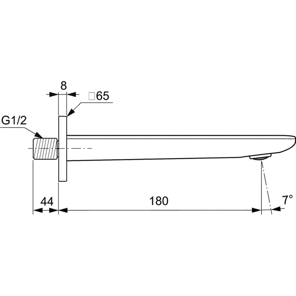 Wylewka długości 180 mm. Metalowa chromowana rozeta 65x65 mm z logo Ideal Standard. Aerator M24x1. Podłączenie G1/4.