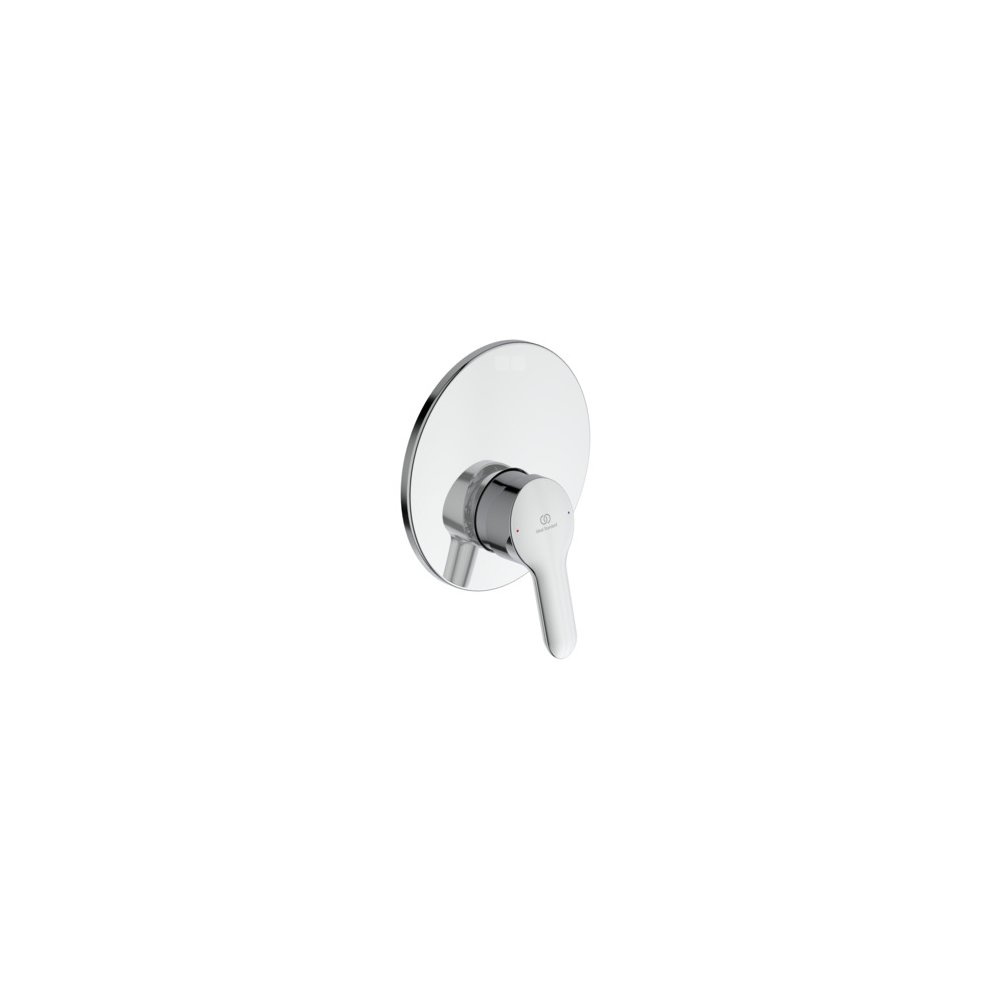 Zestaw montażowy podtynkowej baterii natryskowej (kompletny). Głowica IS 47 mm CLICK. Metalowy uchwyt z nadrukowanymi czerwonymi i niebieskimi oznaczeniami. Chromowana rozeta z tworzywa.