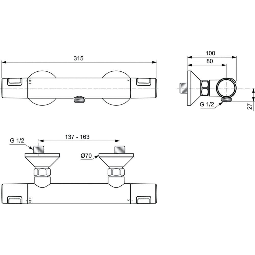 Bateria termostatyczna natryskowa naścienna Ceratherm T25. Standardowe przyłącza mimośrodowe. Głowica termostatyczna IS nowej technologii. Ceramiczny zawór G1/2 180°. Bez akcesoriów w komplecie. Uchwyt z ogranicznikiem temperatury do 40°C i przyciskiem redukującym wypływ o 50%. Zawór zwrotny. Zalecane dodatkowe elementy: nakładana półka do baterii termostatycznych Ceratherm T25, T50 i T100 A7215AA.