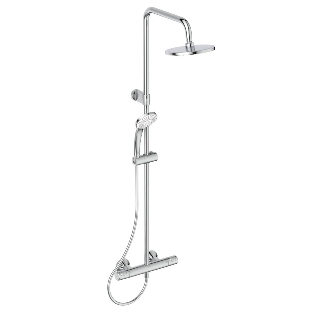 Zestaw natryskowy z baterią termostatyczną wannowo-natryskową ścienną Ceratherm T25. Przyłącza mimośrodowe. Głowica termostatyczna IS. Ceramiczny zawór talerzowy włącz/wyłącz 180°. Zintegrowany przełącznik w uchwycie. Manualny przełacznik bateria/wanna. Uchwyt z ogranicznikiem temperatury do 40°C i przyciskiem redukującym przepływ wody o 50%. Funkcja Cool Body, zapobiegająca ryzyku poparzenia przez nagrzany korpus baterii. Zawór zwrotny. Zgodność z normą EN1111. W zestawie: Plastikowa deszczownica Ø 200mm, z ogranicznikiem przepływu wody do 12 l/min. Trójfunkcyjna słuchawka prysznicowa Idealrain 100 mm, z ogranicznikiem przepływu wody do 8 l/min. Wąż natryskowy Idealflex, 1600 mm. Pozioma rura z funkcją teleskopową do 100 mm (regulacja możliwa tylko podczas montażu).
