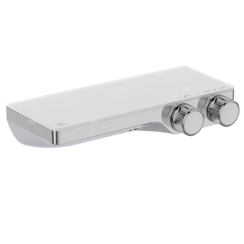 Ukryte przyłącza mimośrodowe, zintegrowane z korpusem baterii. Głowica termostatyczna IS nowej technologii. Regulacja temperatury termostatu przez pokrętło. Uchwyt z ogranicznikiem temperatury do 40°C. Regulacja mocy przepływu przez pokrętło, głowica ceramiczna G1/2’’ 90°. Funcja ECO redukcjąca przepływ wody wody o 50%. Łatwe użytkowanie dzięki pokrętłom umiejscowionym od frontu. Półka wykonana z bezpiecznego szkła w kolorze białym. Przyłącze natryskowe G1/2". Zintegrowane zawory zwrotne w przyłączach baterii. Funkcja Cool body zapobiegająca poparzeniu przez korpus baterii.