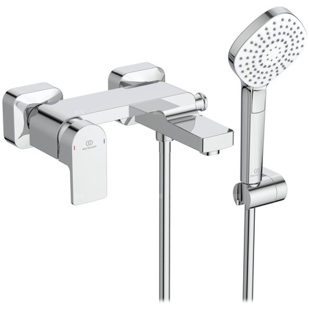 Bateria wannowo-natryskowa ścienna z akcesoriami. Głowica FirmaFlow ISI 38 mm z ogranicznikiem temperatury. Smukły, mosiężny, odlewany korpus. Automatyczny przełącznik. Metalowy uchwyt z logo Ideal Standard oraz nadrukowanymi czerwonymi i niebieskimi oznaczeniami. Zawór zwrotny. Perlator typu Cascade. Osłona śrub przyłączeniowych, ukryte przyłącza mimośrodowe baterii. Klasa akustyczna 1. Zgodna z EN817. Akcesoria: 3-funkcyjna słuchawka prysznicowa, ruchomy uchwyt ścienny, wąż natryskowy.