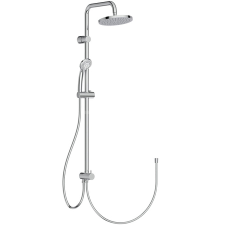 System natryskowy bez mocowania. Dwudrożny, zintegrowany ceramiczny przełącznik: słuchawka/deszczownica. Regulowany, solidny uchwyt ścienny, 2ygięte ramię mocowane do uchwytu ściennego. Trzyfunkcyjna słuchawka prysznicowa z tworzywa: 80 mm, z ogranicznikiem przepływu wody do 8 l/min. Deszczownica z tworzywa: 200mm, z ogranicznikiem przepływu wody do 9,5 l/min. Drążek przepływowy, 1051 mm, Ø 25 mm z uchwytem. IdealFlex 1750 mm gładki wąż natryskowy z zabezpieczeniem przeciwskrętnym, 0,5 m (do podłączenia systemu).