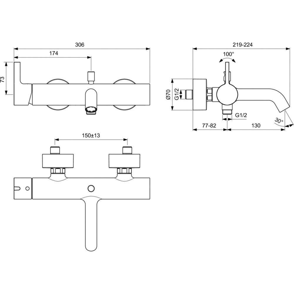 Głowica ceramiczna 38 mm z ogranicznikiem temperatury wody. Logo Ideal Standard umieszczone na korpusie baterii. Metalowy uchwyt bez oznaczenia wody ciepłej i zimnej. Zawór zwrotny. Osłonięte i wyciszone przyłącza ścienne. Aerator typu Caché M24x1i. Automatyczny przełącznik wanna/natrysk.