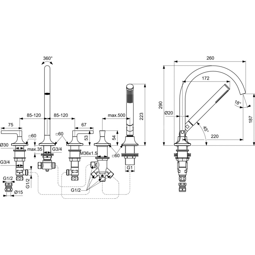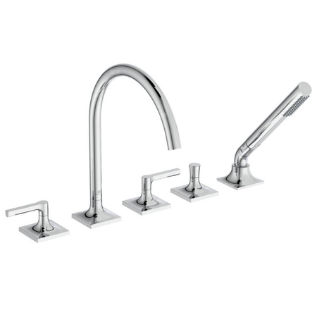 Bateria natryskowo-wannowa 4-otworowa, wylewka, uchwyty dźwigniowe.