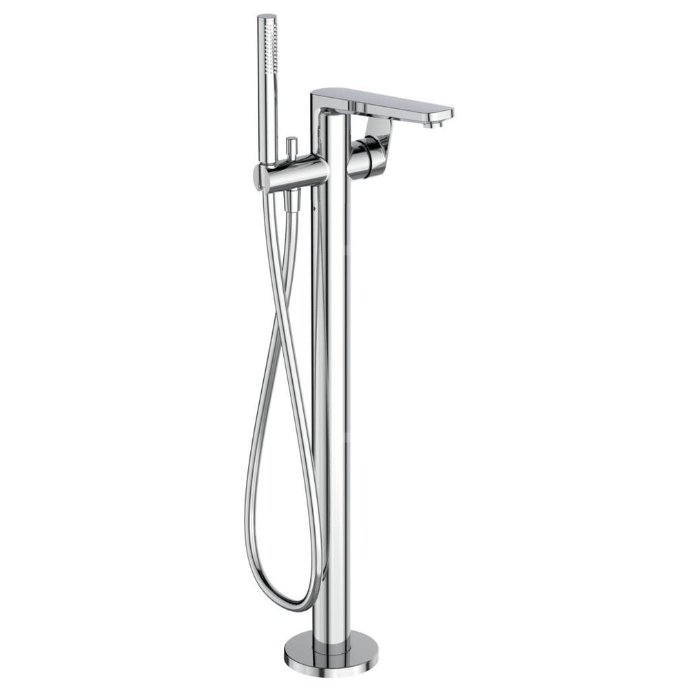 Bateria wannowo-natryskowa wolnostojąca Tonic II. Głowica Multiport 40 mm z ogranicznikiem temperatury. Mosiężny korpus wykonany z dwóch części z automatycznym przełącznikiem. Perlator typu Cascade z regulacją kierunku strumienia. Metalowy uchwyt z nadrukowanymi czerwonymi i niebieskimi oznaczeniami. Słuchawka natryskowa Stick, gładki wąż natryskowy IdealFlex 1250 mm. Zestaw montażowy z regulowaną głębokością montażu w posadzce w zakresie 80-160 mm. Rozeta podłogowa chromowana. Do skompletowania z elementem montażowym: A6133NU.