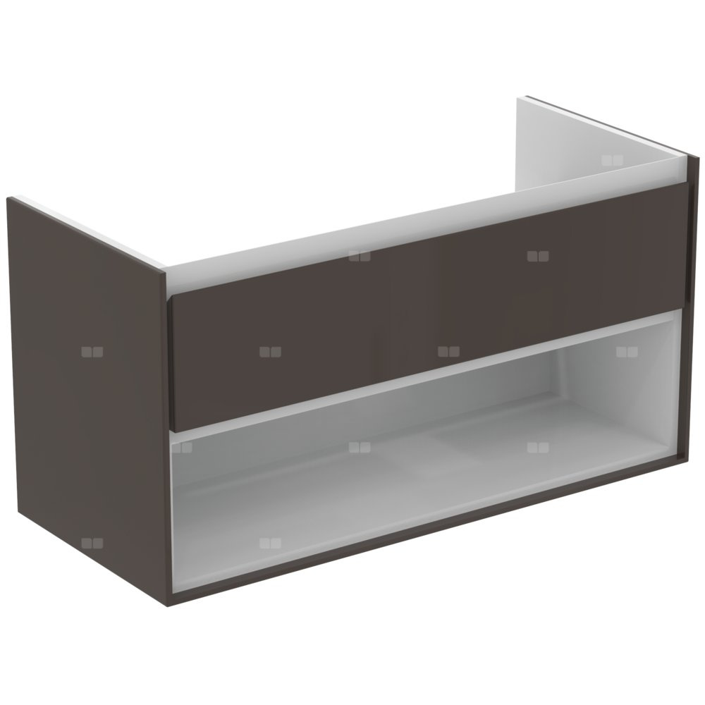 Wisząca 100 cm. 1 szuflada ze zintegrowanym uchwytem. Szuflady z systemem samodomykania. Otwarta dolna półka. Zestaw montażowy w komplecie. Szafka do skompletowania z: umywalką z powierzchniami bocznymi 104 cm E027401 lub. umywalką nablatową 60 cm E034801/40 cm E034701 z wymaganym blatem E0851. Zalecany: syfon oszczędzający przestrzeń EE23033967 (zamawiany oddzielnie).