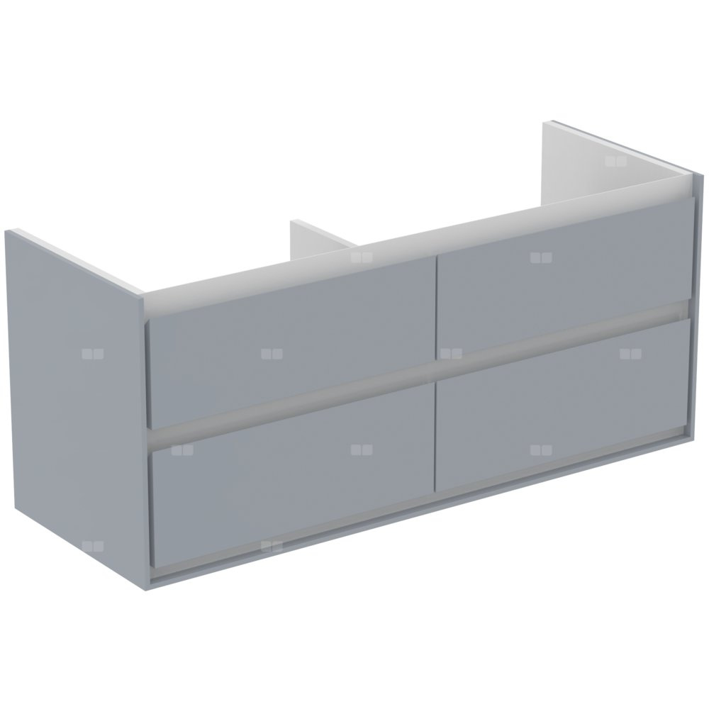 Wisząca 120 cm. 4 szuflady ze zintegrowanymi uchwytami. Szuflady z systemem samodomykania. Zestaw montażowy w komplecie. Szafka do skompletowania z: umywalką z powierzchniami bocznymi 124 cm E027301 lub. umywalką nablatową 60 cm E034801 (2 szt)/40 cm E034701 (2 szt) z wymaganym blatem E0852. Zalecany: syfon oszczędzający przestrzeń EE23033967 (zamawiany oddzielnie).