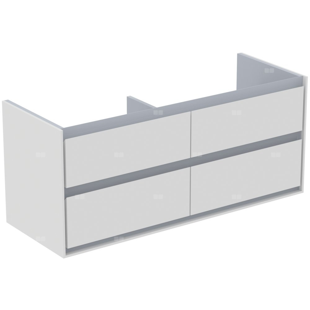 Wisząca 120 cm. 4 szuflady ze zintegrowanymi uchwytami. Szuflady z systemem samodomykania. Zestaw montażowy w komplecie. Szafka do skompletowania z: umywalką z powierzchniami bocznymi 124 cm E027301 lub. umywalką nablatową 60 cm E034801 (2 szt)/40 cm E034701 (2 szt) z wymaganym blatem E0852. Zalecany: syfon oszczędzający przestrzeń EE23033967 (zamawiany oddzielnie).