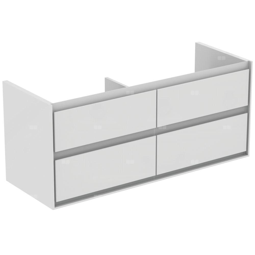Wisząca 120 cm. 4 szuflady ze zintegrowanymi uchwytami. Szuflady z systemem samodomykania. Zestaw montażowy w komplecie. Szafka do skompletowania z: umywalką z powierzchniami bocznymi 124 cm E027301 lub. umywalką nablatową 60 cm E034801 (2 szt)/40 cm E034701 (2 szt) z wymaganym blatem E0852. Zalecany: syfon oszczędzający przestrzeń EE23033967 (zamawiany oddzielnie).