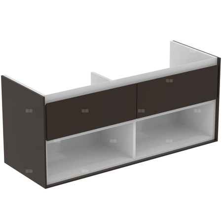 Wisząca 120 cm. 2 szuflady ze zintegrowanymi uchwytami. Szuflady z systemem samodomykania. Otwarte dolne półki. Zestaw montażowy w komplecie. Szafka do skompletowania z: umywalką z powierzchniami bocznymi 124 cm E027301 lub. umywalką nablatową 60 cm E034801 (2 szt)/40 cm E034701 (2 szt) z wymaganym blatem E0852. Zalecany: syfon oszczędzający przestrzeń EE23033967 (zamawiany oddzielnie).
