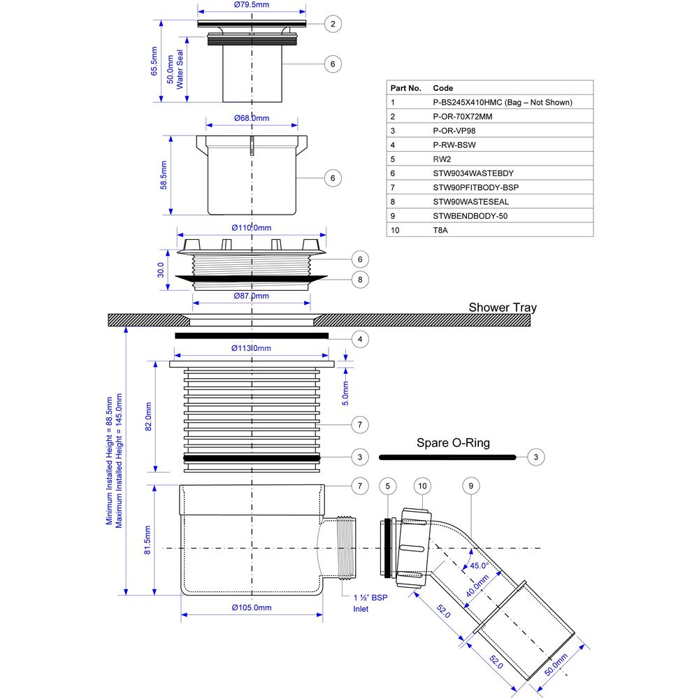 Syfon do odpływów kwadratowych z regulowaną wysokością w zakresie od 88,5 do 145mm.