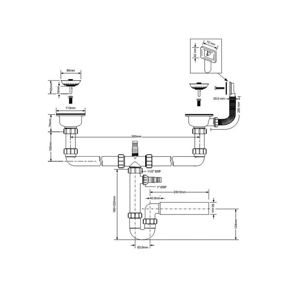 Syfon zlewozmywakowy rurowy podwójny 11/2"x50mm z podłączeniem do pralki i zmywarki, ze spustami 113mm i przelewem z ujsciem okrągłym.
