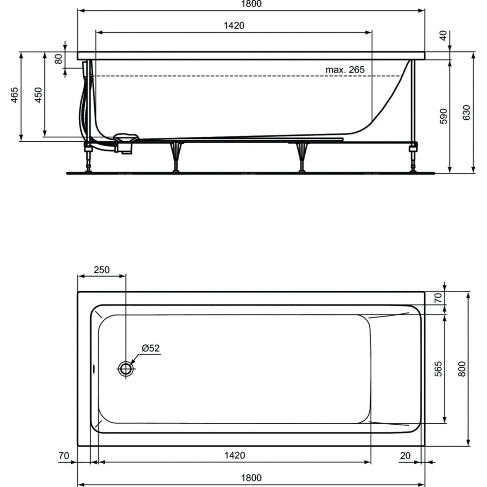 Wanna wykonana z wysokiej jakości akrylu sanitarnego o grubości 4 mm. Bez otworu na baterię. Otwór na syfon Ø52 mm. W komplecie nogi do wanny i zestaw odpływowo-przelewowy (do zamówienia osobno - T00077001 oraz TT6105969). Z panelem bocznym oraz przednim. Pojemność 265 l. Niezbędne wyposażenie: - Łącznik syfonu wanny - do przyłącza kanalizacji T00077001. Rura rozszerzająca z Ø40 do Ø50 TT6105969.