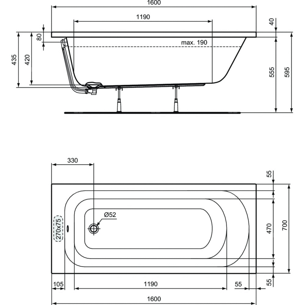 Wanna akrylowa Simplicity z bocznym otworem na syfon i przelew: Ø 52 mm. Wykonana z wysokiej jakości akrylu sanitarnego 3,2 mm z drewnianym wzmocnieniem konstrukcyjnym dna i krawędzi.