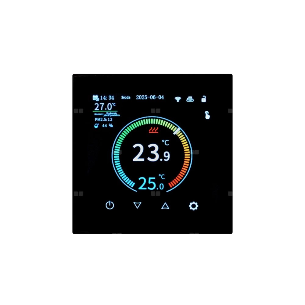 z funkcją zdalnego sterowania przez Wi-Fi. Montowany podtynkowo doskonale wpisuje się w estetykę nowoczesnych wnętrz. Wyposażony w czytelny ekran TFT IPS o wysokiej rozdzielczości oraz intuicyjne menu, umożliwia precyzyjne zarządzanie temperaturą w zakresie