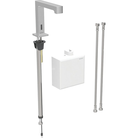 Bateria umywalkowa Geberit Brenta, stojąca, zasilanie generatorowe, z natynkową skrzynką funkcyjną, z mieszaczem, stal nierdzewna