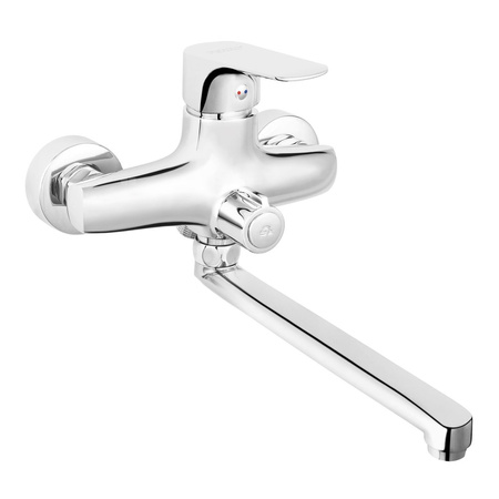 Bateria umywalkowa z funkcjonalną, ruchomą wylewką. Uniwersalne przyłącze 1/2" umożliwia zastosowanie dowolnego zestawu natryskowego. Ceramiczny, ergonomiczny przełącznik wylewka/natrysk zapewnia łatwość w obsłudze.